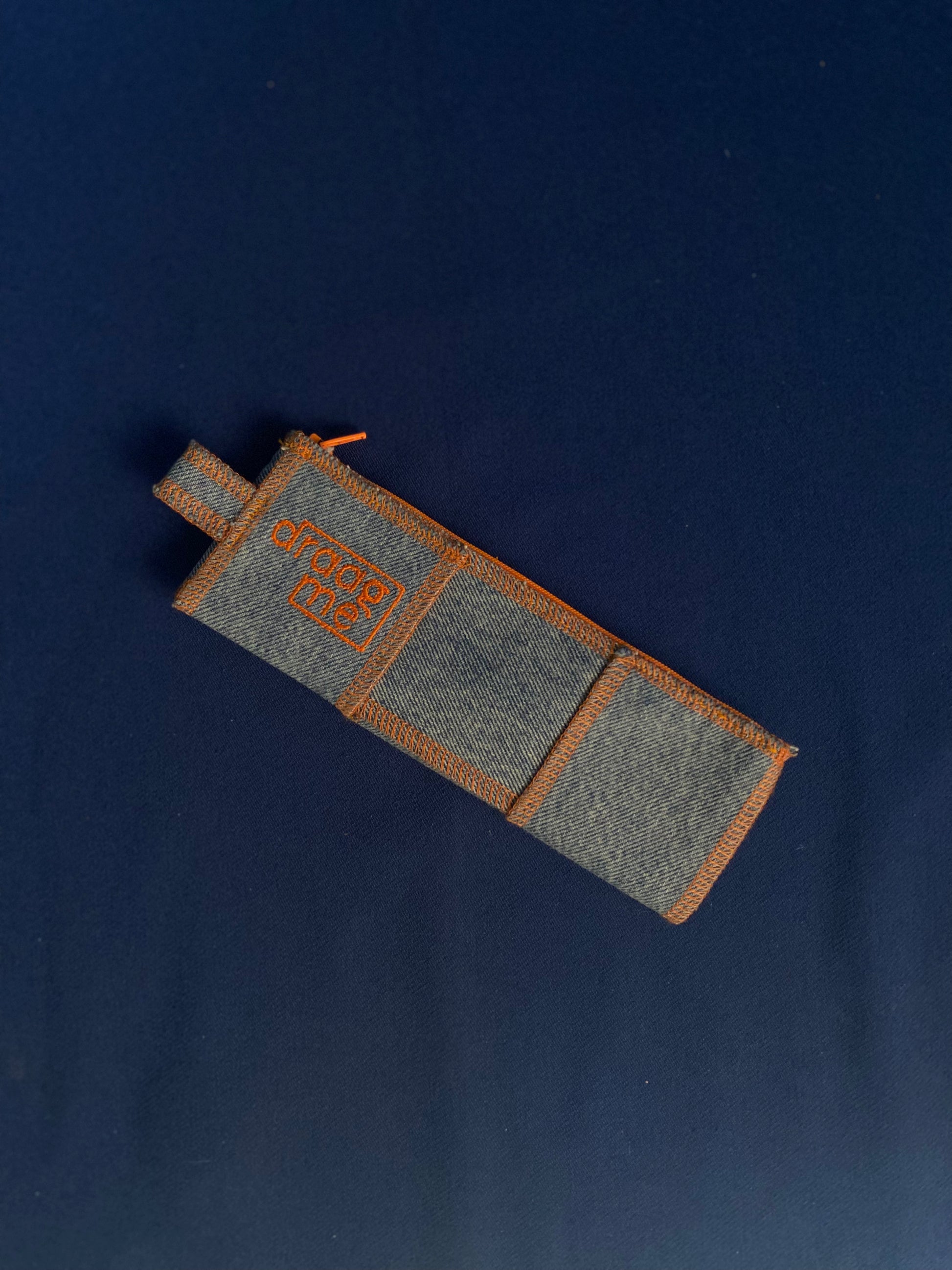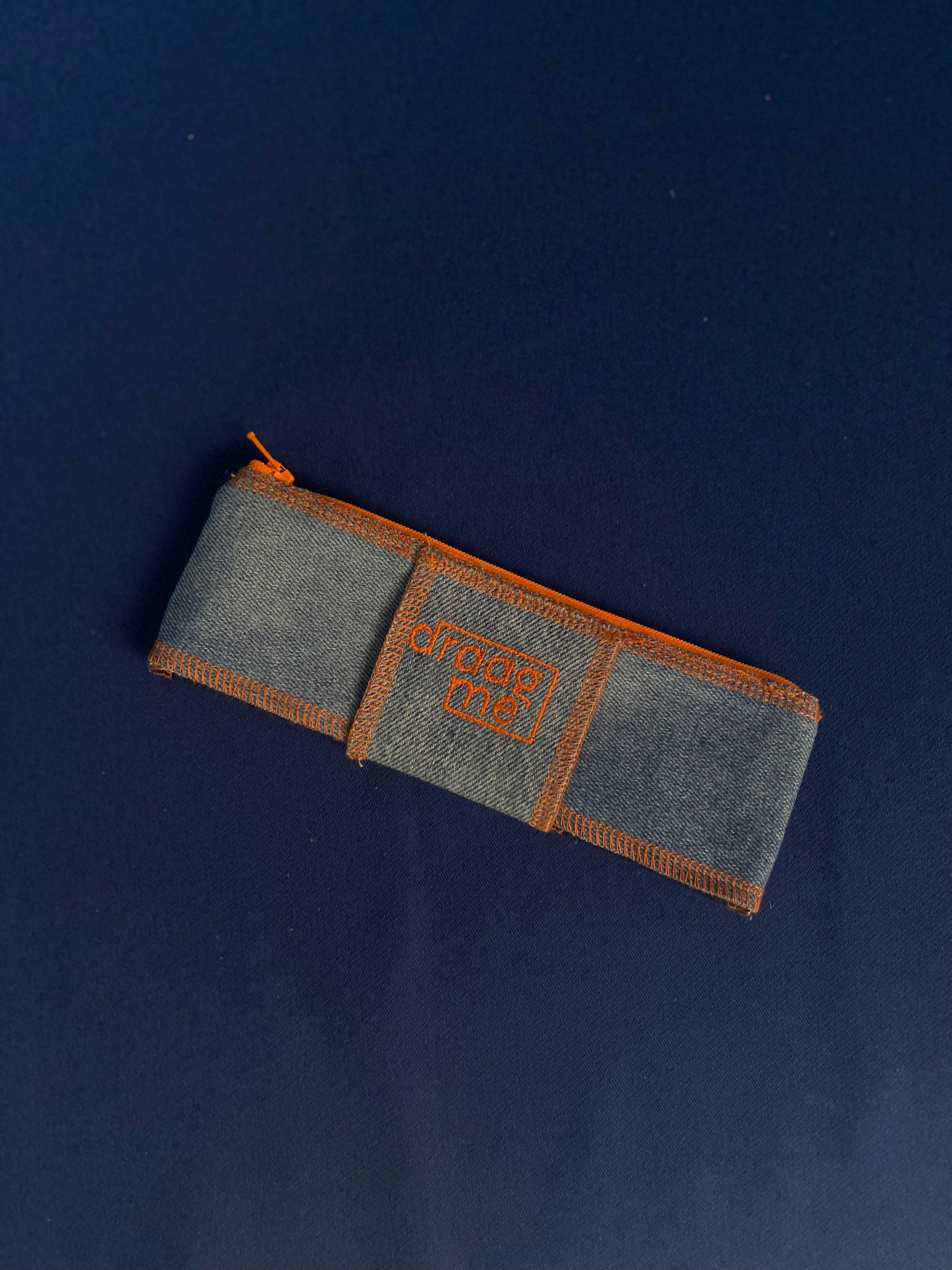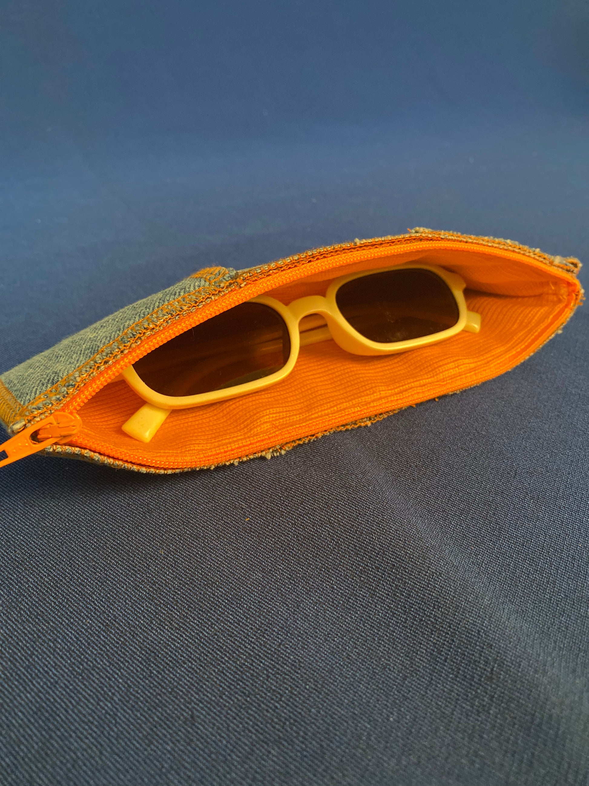 Handgemaakte brillenhoes/pennenzak uit gerecycleerde jeans met oranje afwerking