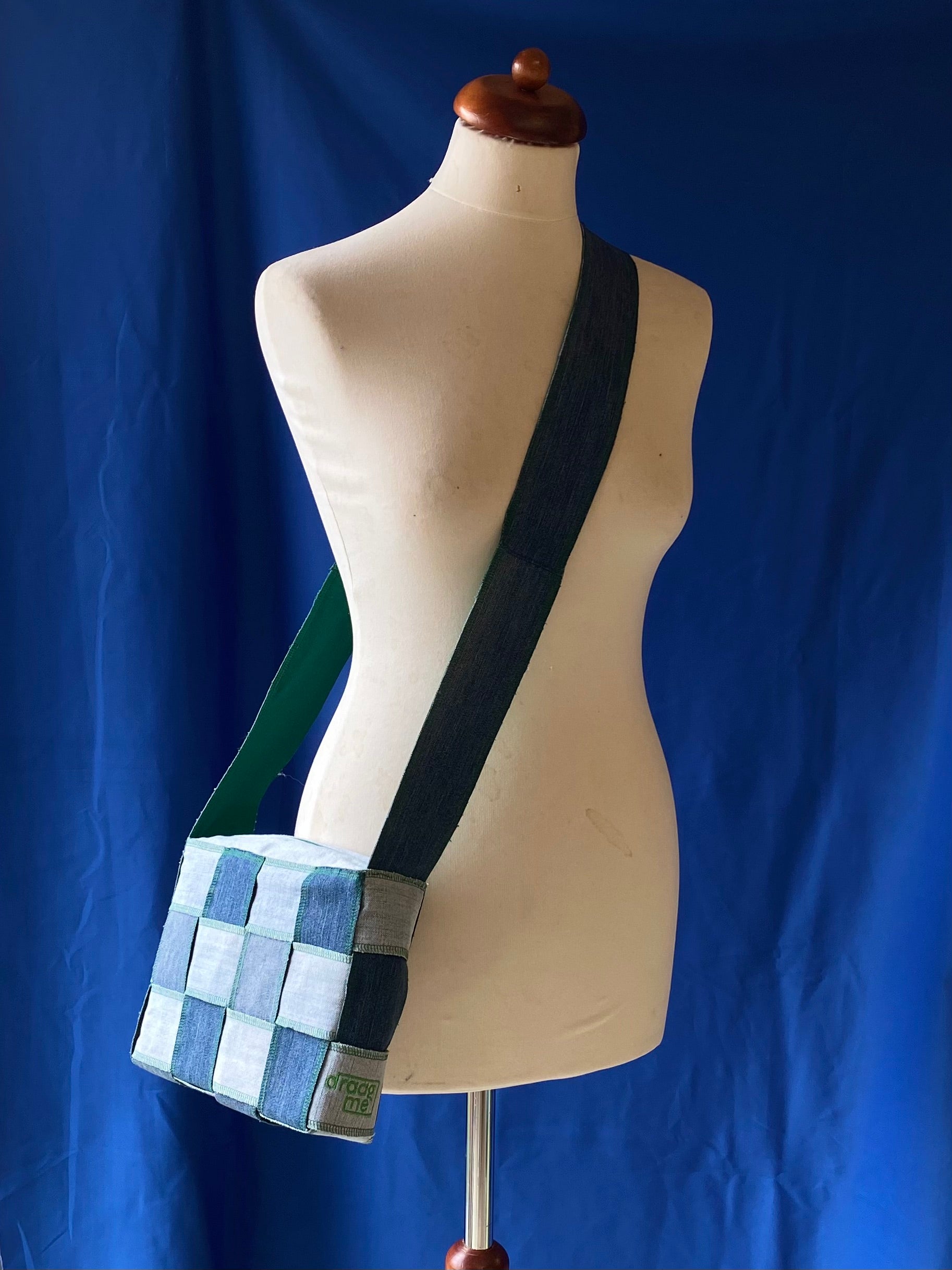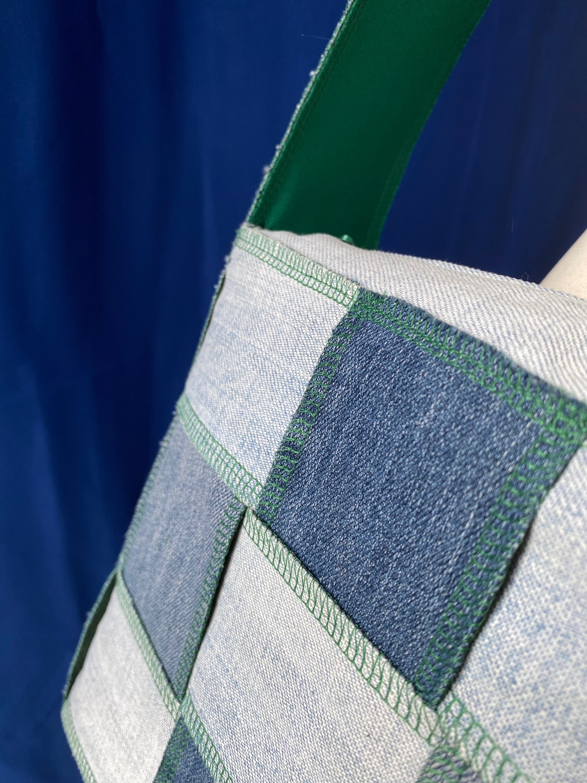 Handgemaakte handtas uit gerecycleerde jeans met groene afwerking