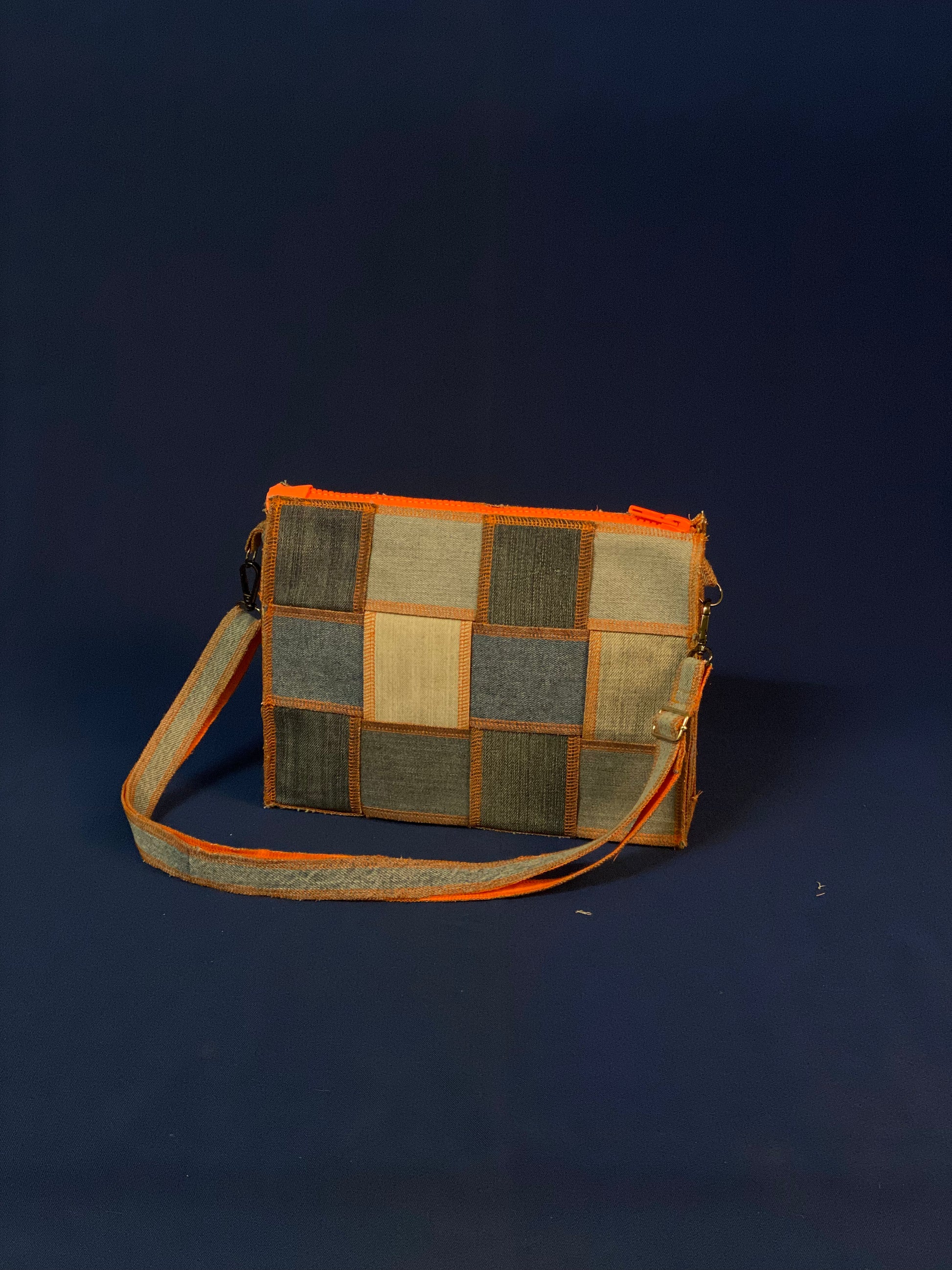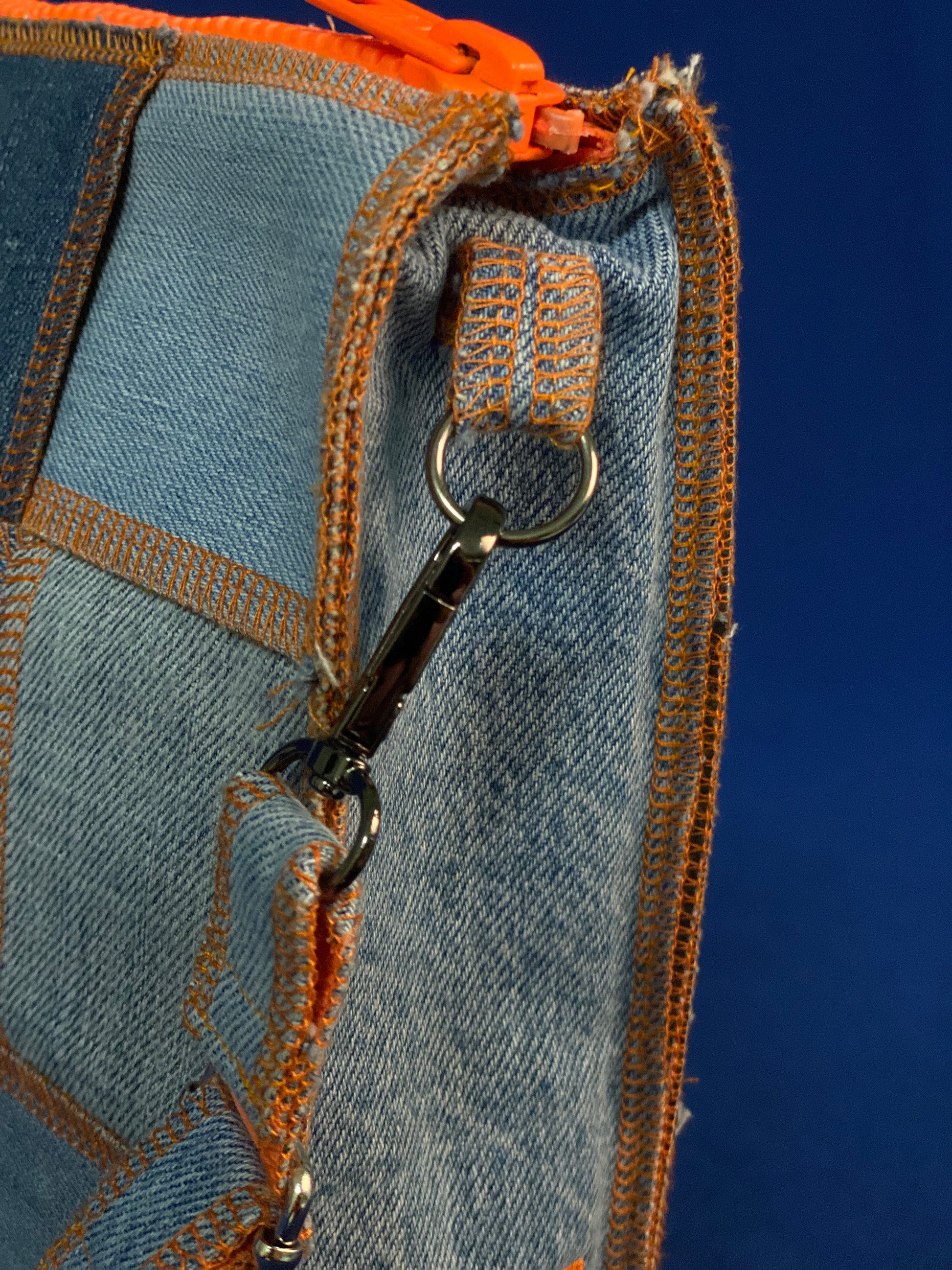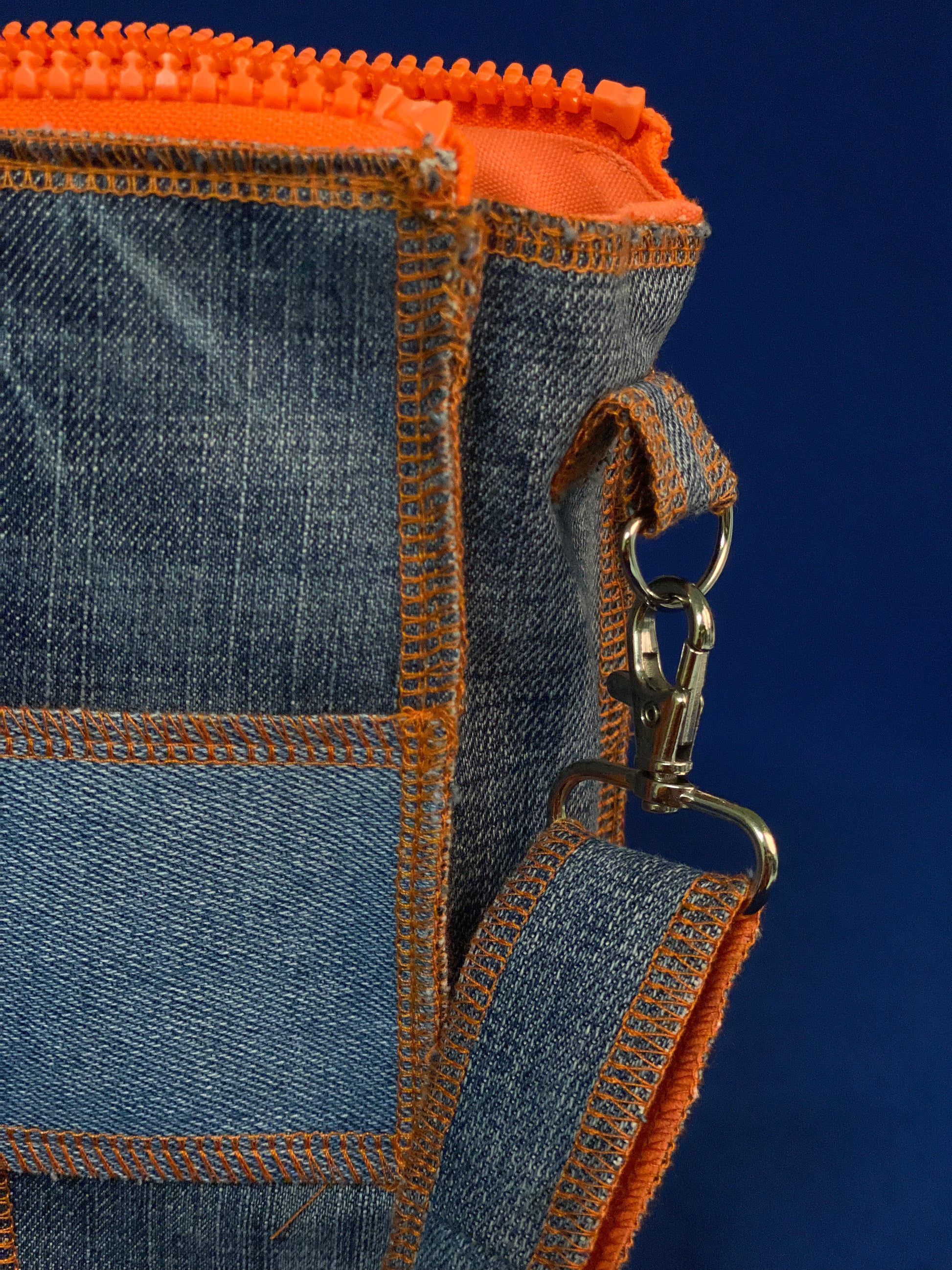 Handgemaakte handtas uit gerecycleerde jeans met oranje afwerking
