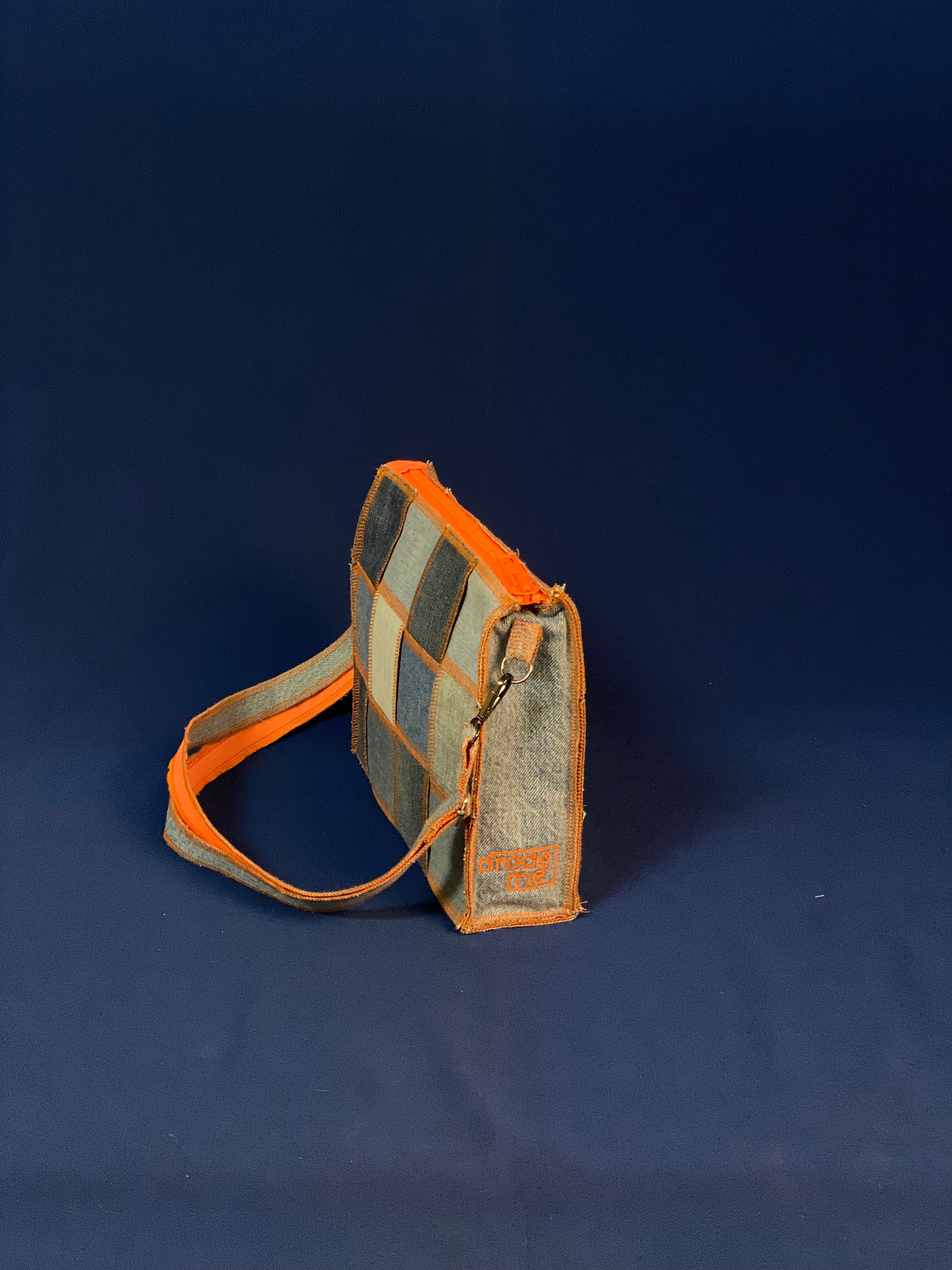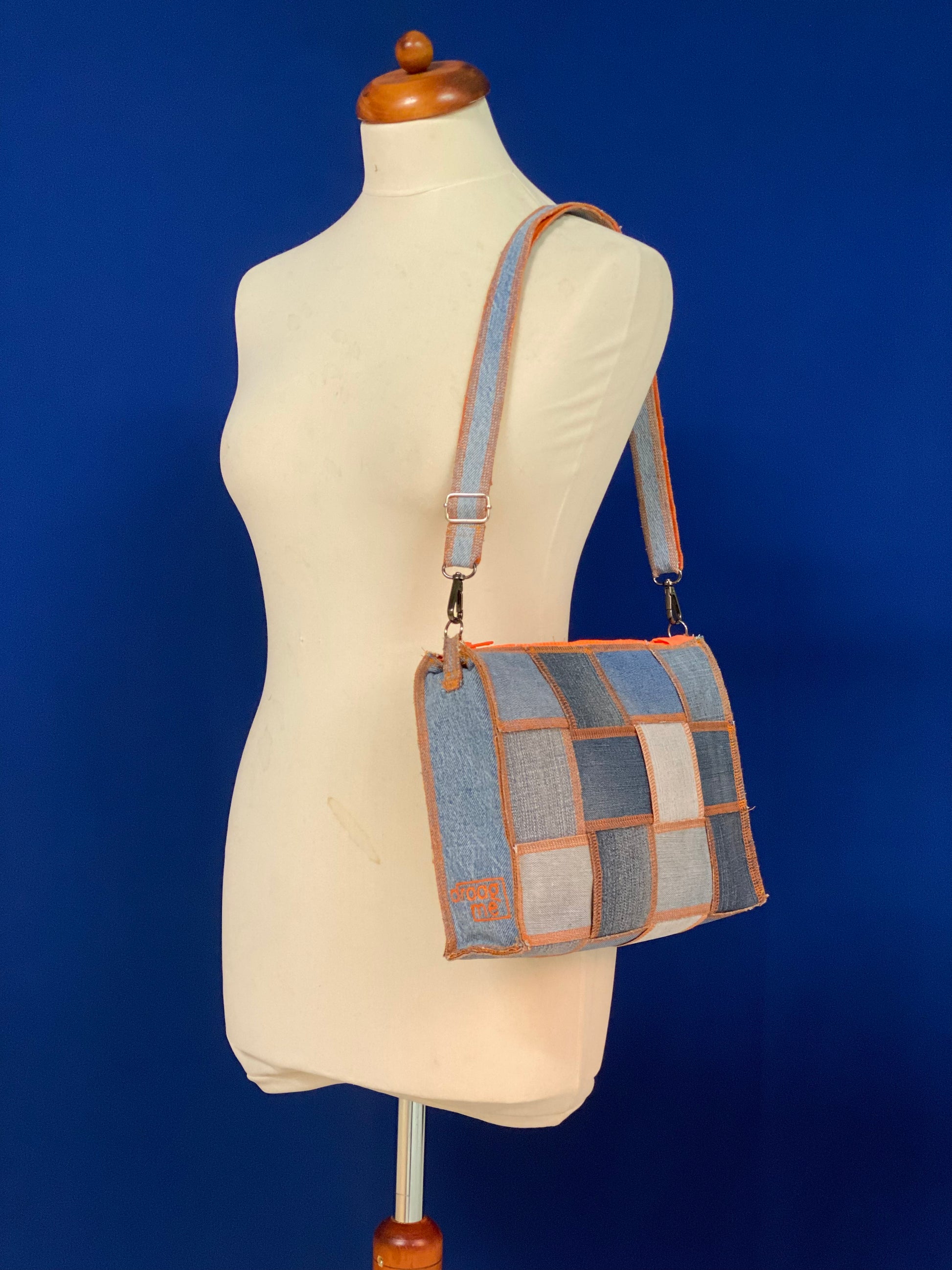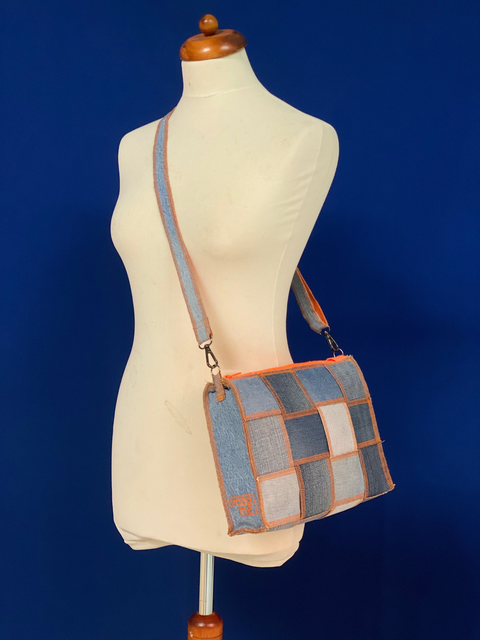 Handgemaakte handtas uit gerecycleerde jeans met oranje afwerking
