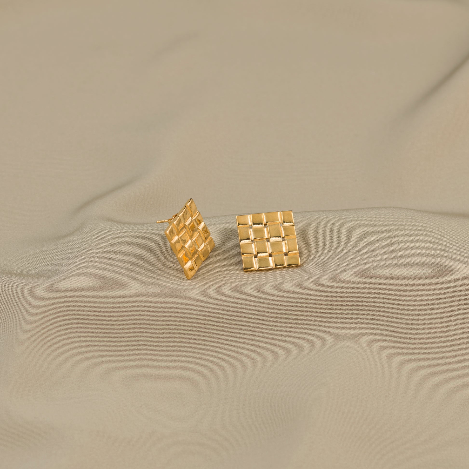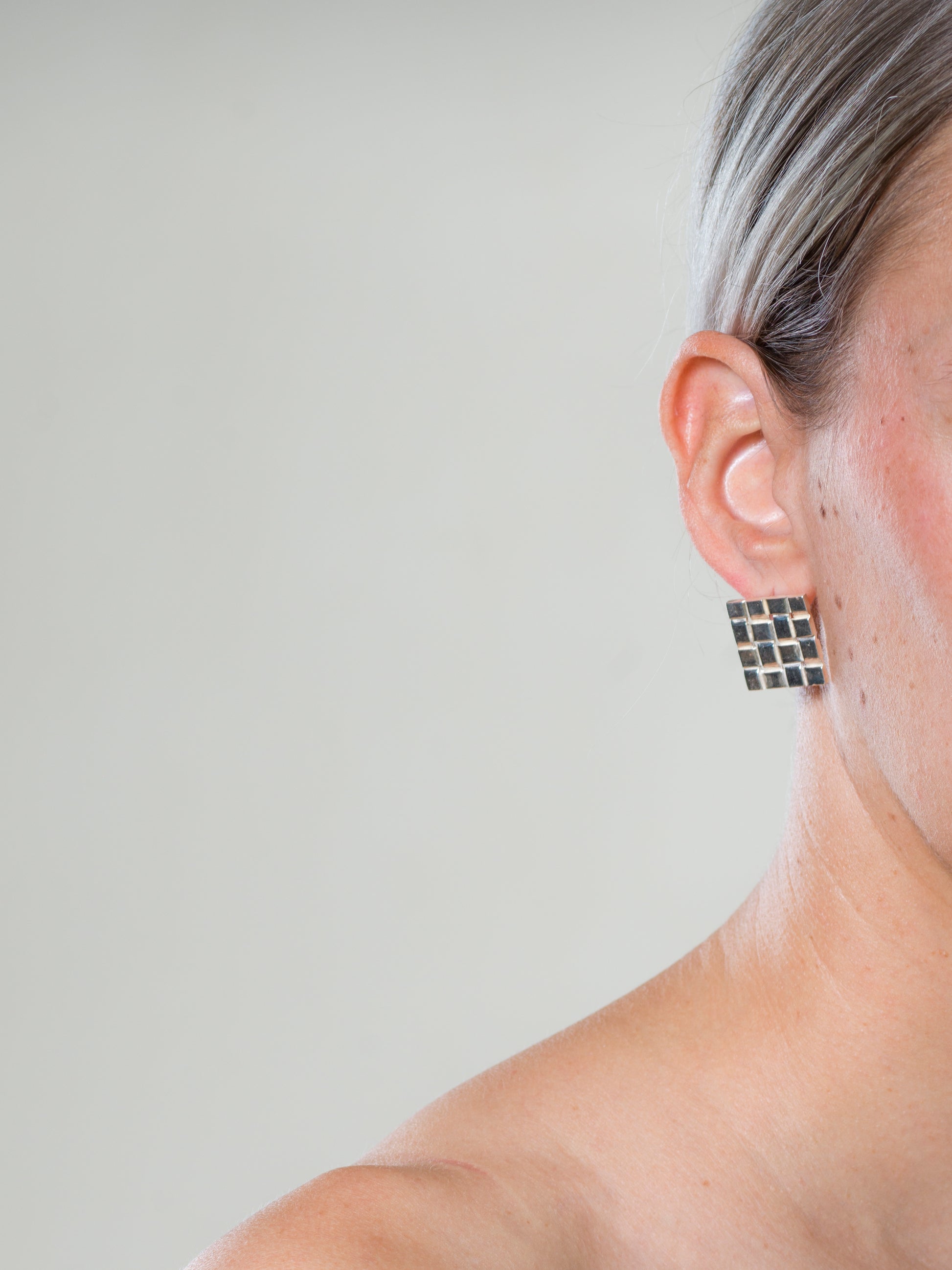 Vierkante oorstekers met geweven oppervlak (2cm op 2cm). Poussetvlinders als sluiting.