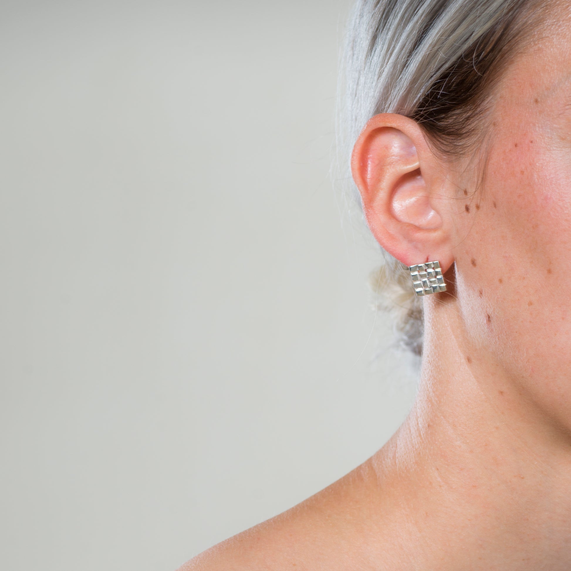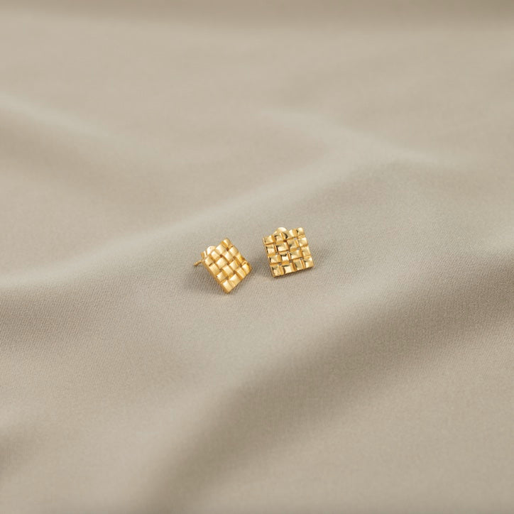 Vierkante oorstekers met geweven oppervlak (12mm x 12mm). Poussetvlinders als sluiting.