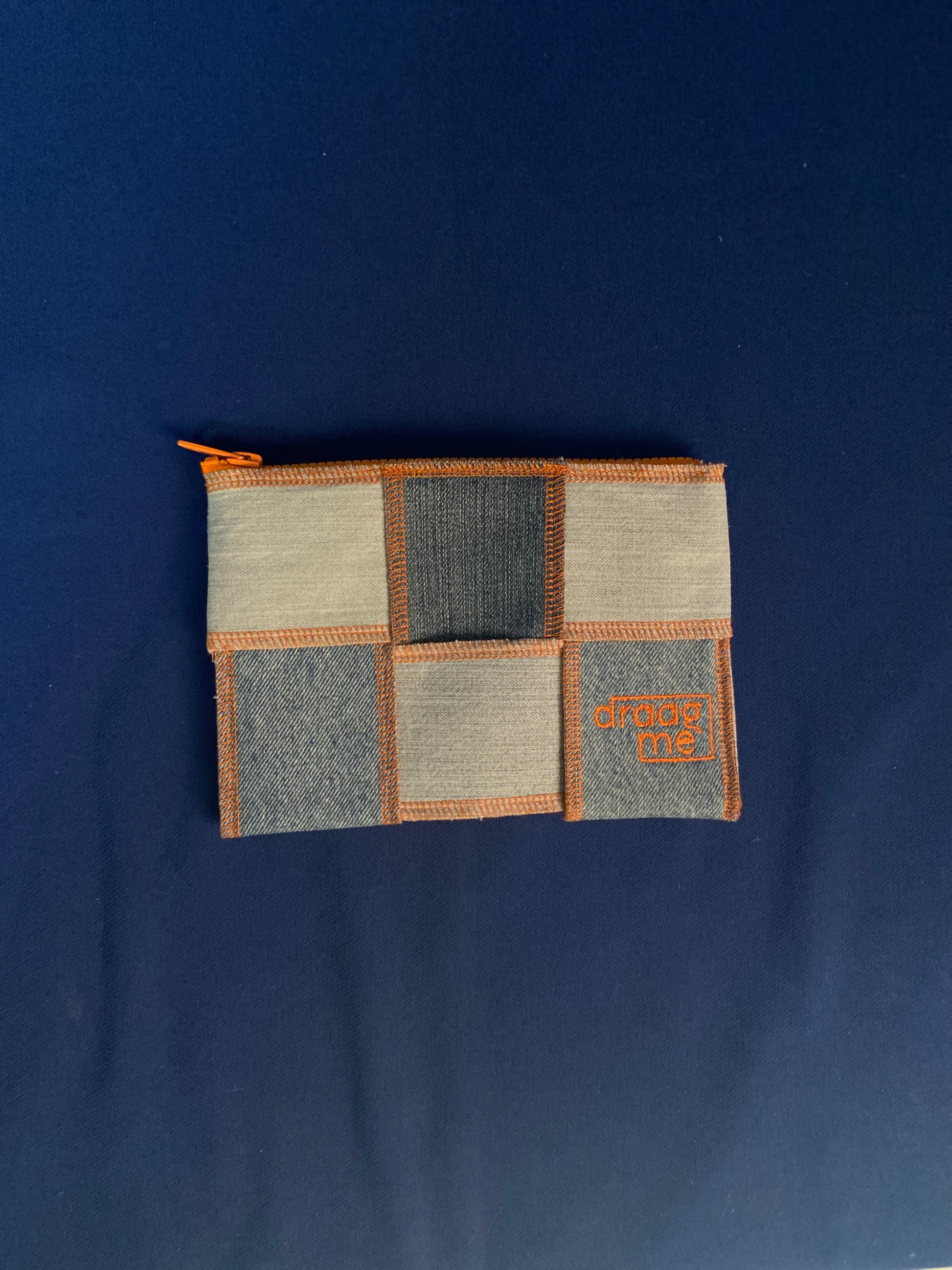 Handgemaakte opbergtas uit gerecycleerde jeans met oranje afwerking