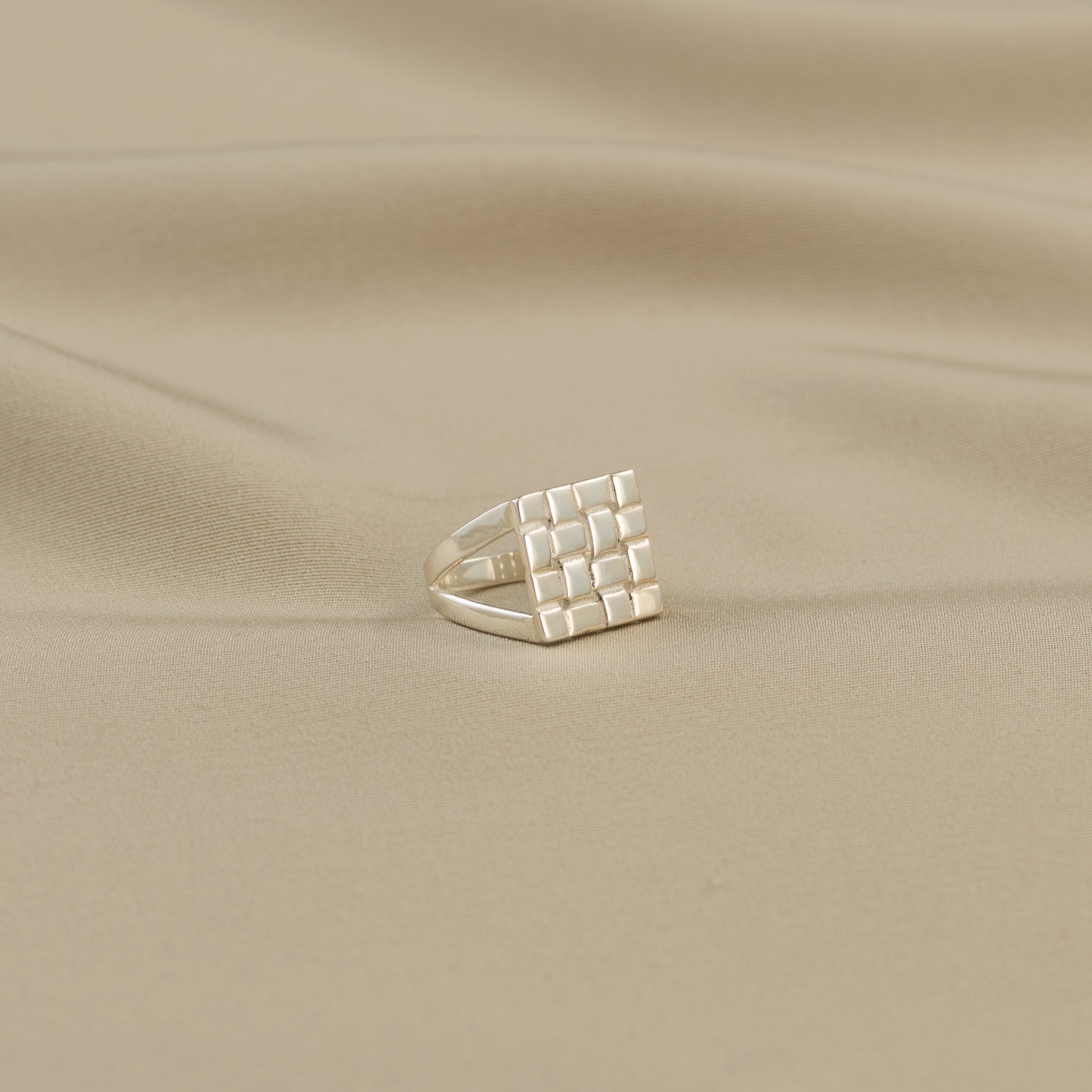 Ring met effen band die opsplitst naar het middenstuk (3,5mm breed) vierkant middenstuk met geweven structuur (14mm x 14mm)
