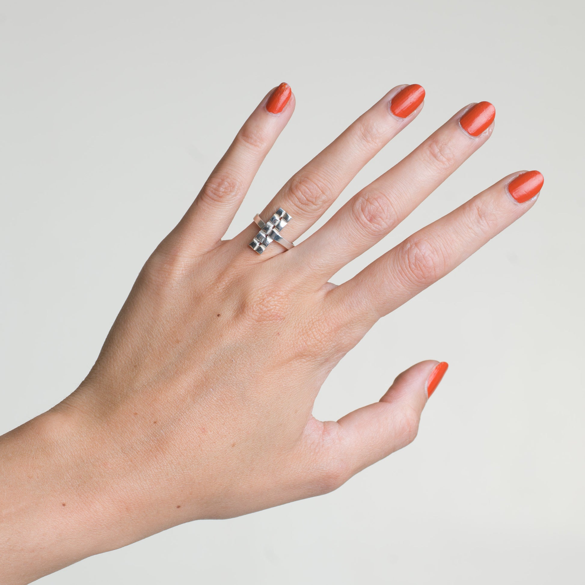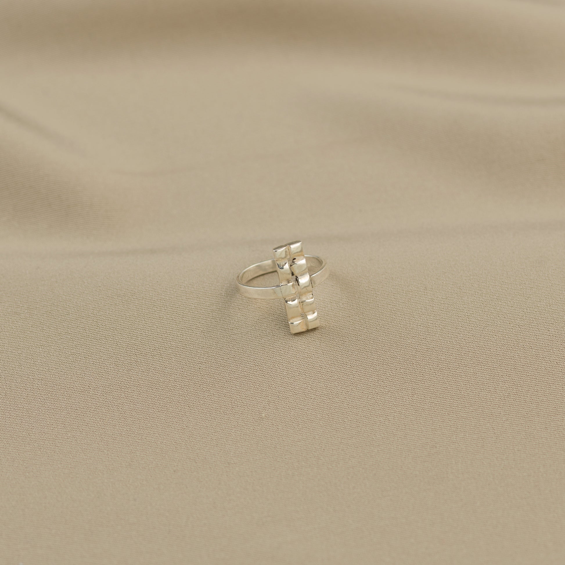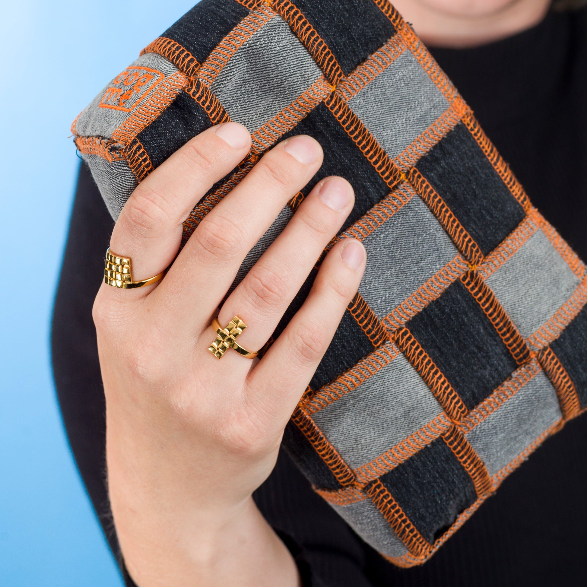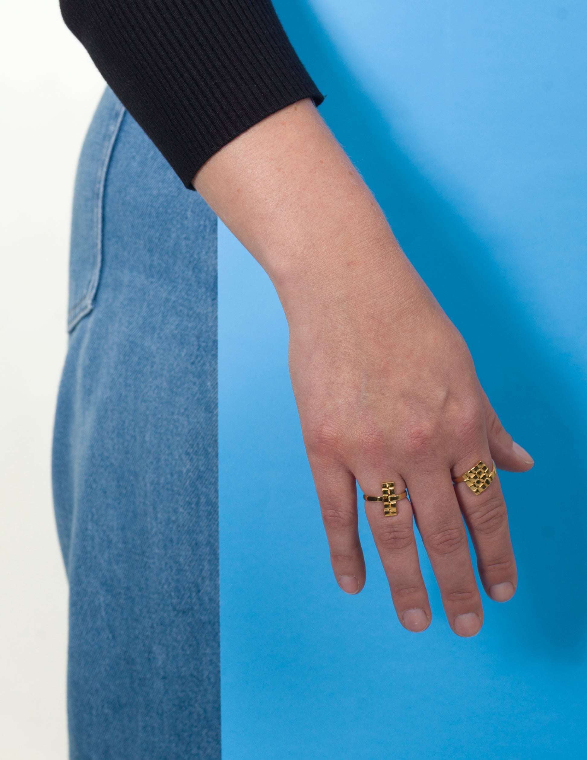 Ring met een fijne effen band (2,5mm dik) verticaal geweven stuk in het midden (5mm x 17mm)